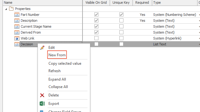 Параметр Создать из позволяет скопировать поле в объект для создания новых полей с теми же настройками.
