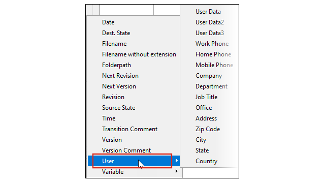 Список переменных в диалоговом окне Действие перехода содержит поля свойств пользователя, которые были добавлены в SOLIDWORKS PDM 2022.