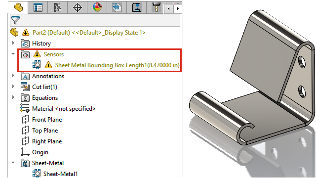 Датчики можно использовать для оповещения об отклонении моделей из листового металла от пределов, указанных для граничной рамки. В многотельных деталях можно создать датчики для отдельных тел.