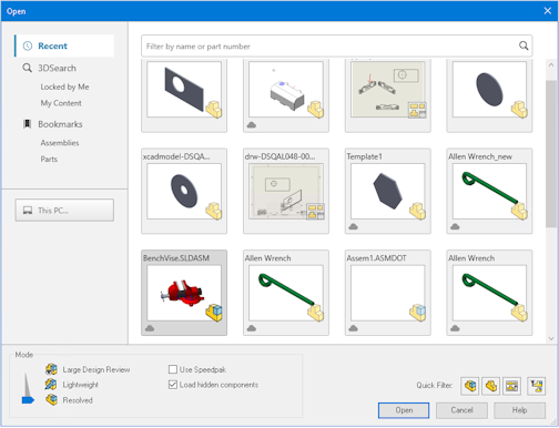 Для поиска файлов или закладок на платформе можно использовать команды 3DSearch или Закладки. Дважды нажмите на объект, чтобы открыть его. Можно также выбрать несколько объектов и открыть их. Чтобы выполнить поиск локальных файлов, нажмите Этот ПК для возврата к стандартному диалоговому окну SOLIDWORKS Открыть.