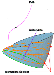 Seleccione Seguir trayecto y primera curva guía si desea que la torsión de las secciones intermedias esté determinada por el vector desde el trayecto hasta la primera curva guía. El ángulo entre el plano horizontal y el vector permanece constante en los planos de croquis de todas las secciones intermedias.