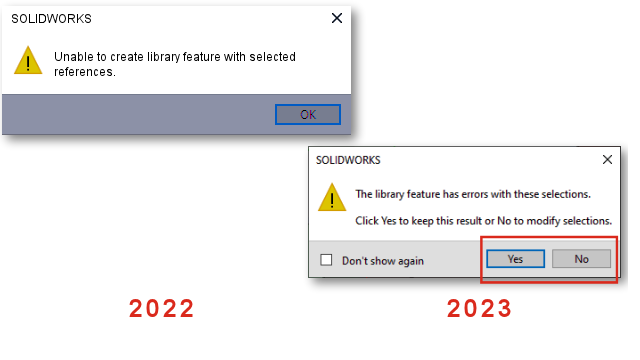 En el mensaje de advertencia, haga clic en Sípara mantener los resultados. En el gestor de diseño del FeatureManager®, puede reparar manualmente la operación de biblioteca o hacer clic en Deshacer