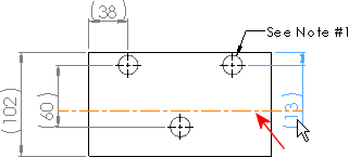 Arrastre una nota y «engánchela» al texto de la cota, como indica la línea de inferencia discontinua.