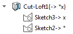 Operación que contiene un croquis con referencias externas. Operación que tiene una referencia externa y contiene un croquis con una referencia externa. Operación que contiene croquis con referencias externas en varios estados.