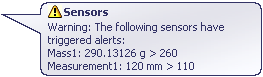 Opcionalmente es posible configurar una alerta para que le avise de inmediato cuando el valor del sensor se desvíe de los límites que usted especifica. Cuando un sensor dispara una alerta, el sensor tiene un indicador en el gestor de diseño del FeatureManager.