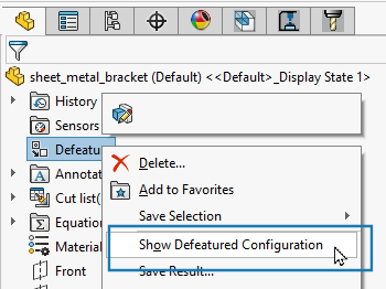 Üst öğe konfigürasyonunu ve türetilmiş defeature konfigürasyonunu görüntüleme arasında geçiş yapabilirsiniz. Üst öğe konfigürasyonunu görüntülüyorsanız defeature edilmiş konfigürasyona geçmek için FeatureManager tasarım ağacında Defeature objesine sağ tıklayın ve