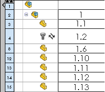 Malzeme listesi bileşenlerinin girintili görünümünde, Malzeme Listesi Montaj Yapısı sütunundaki ilk alt montaja