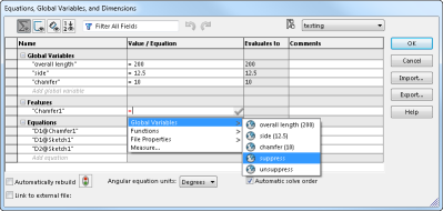 Bu unsurun adı Unsurlar bölümünde görünür. SOLIDWORKS sonraki hücreyi = (eşittir işareti) ile doldurur ve Global Değişkenler, Fonksiyonlar, Dosya Özellikleri ve Ölçüm seçenekleri olan bir liste görüntüler.