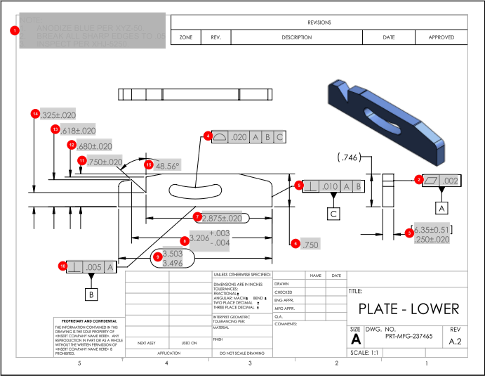 您可以使用 SOLIDWORKS Inspection 附加程式,在 SOLIDWORKS 中快速產生含零件號球的工程圖和檢查報告。 您可以在獨立應用程式中開啟檢查專案 (.ixprj),以輸入測量數值及輸入 CMM 結果。