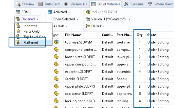 零件表 (BOM) 視圖 - 展平類型 (2024 SP2) 在 SOLIDWORKS PDM 檔案 Explorer 中,在零件表標籤的 BOM 視圖中,您可以使用新型的展平 ,檢視產品結構中存在的零組件所需總數。 此選項可節省計算零組件總數量的時間與精力。 展平的 BOM 視圖會顯示: 以零組件清單的格式顯示產品結構,而不縮排。 如果零組件位於產品結構的多個層級,則只會顯示一次。 透過在各層級增加數量,以顯示零組件數量。 在桌面用戶端和 Web2 中檢視經計算的 BOM 時,可以使用展平類型。 上層主題SOLIDWORKS PDM