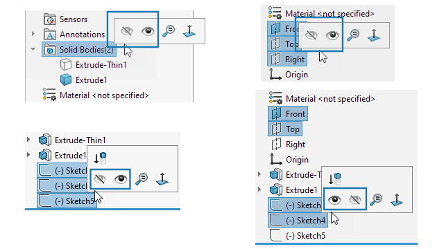 sketches that have a combination of shown and hidden states in the FeatureManager design