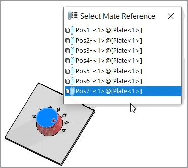 En este ejemplo está creando una referencia de relación de posición entre una perilla y una placa. La placa tiene varias posiciones que puede seleccionar.