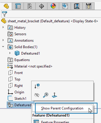 Puede cambiar entre la visualización de la configuración padre y la configuración simplificada derivada. Si está visualizando la configuración padre, para cambiar a la configuración simplificada, haga clic con el botón derecho en la entidad simplificada en el gestor de diseño de FeatureManager y haga clic en