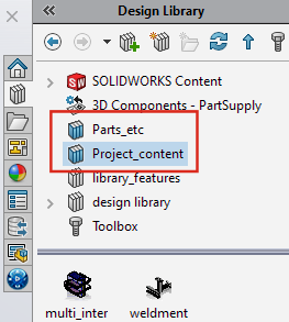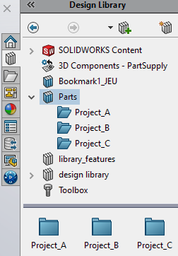 Si marca piezas y ensamblajes en 3DEXPERIENCE Platform, puede utilizar ese contenido en su SOLIDWORKS Design Library. Una biblioteca de diseño definida por un marcador se conoce como una Connected Design Library