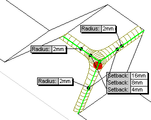 Redondeo adaptado con Vista preliminar completa y con la misma Distancia de adaptado de 12 mm aplicada a las tres aristas. Redondeo adaptado con Vista preliminar completa y con una Distancia de adaptado distinta aplicada a las tres aristas.