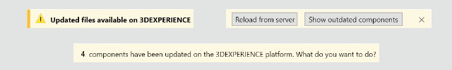 Cuando el sistema abre archivos de 3DEXPERIENCE desde su equipo, la barra de mensajes le notifica sobre las nuevas actualizaciones de los archivos en la plataforma.