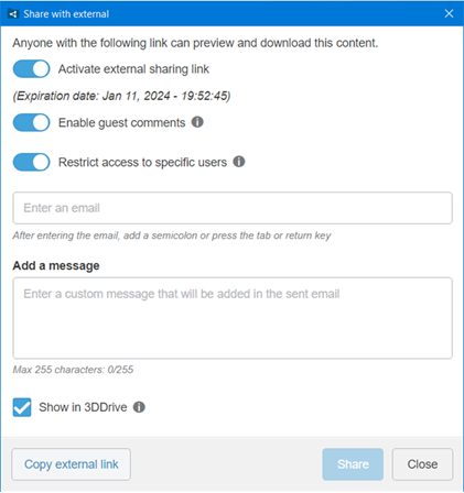 Una notificación confirma que la carga de archivo se realizó correctamente en 3DDrive. Aparece el cuadro de diálogo Compartir con externo.