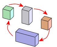 En este modelo de ensamblaje se define el mismo grado de libertad para el bloque azul mediante dos relaciones de posición de distancia que definen el modelo en exceso. A pesar de que las relaciones de posición son consistentes en lo referido a la geometría, es decir, ninguna se viola, el modelo aún está definido en exceso. |