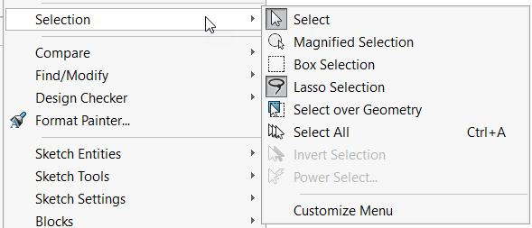 En piezas y ensamblajes, puede abrir la barra de herramientas de contexto de selección haciendo clic con el botón derecho del ratón en un espacio en blanco de la zona de gráficos.