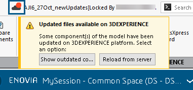Cuando el sistema abre archivos de 3DEXPERIENCE desde su equipo, la barra de mensajes le notifica sobre las nuevas actualizaciones de los archivos en la plataforma.