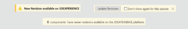3DEXPERIENCE desde su equipo, teniendo uno o más componentes del ensamblaje versiones más recientes en la plataforma, las barras de mensajes le notifican sobre las nuevas versiones disponibles en la plataforma.