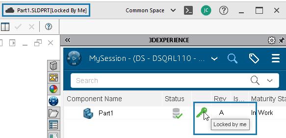 Puede ver la información del ciclo de vida de los archivos de MySession directamente en el árbol de diseño de FeatureManager y en otras ubicaciones en la aplicación Design with SOLIDWORKS.
