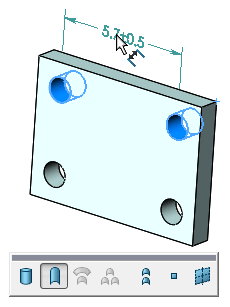 Uso de la herramienta Cota de ubicación de DimXpert Para utilizar la herramienta Cota de ubicación de DimXpert: Haga clic en Cota de ubicación (barra de herramientas Cota MBD) o Herramientas > Cota MBD > Cota de ubicación. Seleccione la cara de la operación de origen. La selección de aristas sólo se admite al crear una cota entre dos planos. Aparece el Selector de operaciones en la zona de gráficos con la opción Taladro seleccionada. Puede seleccionar otro tipo de operación en el selector de operaciones. Haga clic en la cara de la operación de tolerancia. El selector de operaciones queda en pantalla con un tipo de operación predeterminado seleccionado para la operación de tolerancia. Puede seleccionar otro tipo de operación en el selector de operaciones. La cota de ubicación está lista para situarse. Haga clic para situar la cota. Aparece el PropertyManager DimXpert. Las operaciones de taladro seleccionadas se enumeran como Operación de origen y Operación de tolerancia en Operaciones de referencia. Puede hacer clic en Operaciones Intercambiar para revertir las operaciones. En general, puede unir cotas a cualquier arista de la operación. Seleccione la cota y utilice su asa de arrastre para volver a ubicar la cota. Configure las opciones restantes del PropertyManager y haga clic en . El DimXpertManager se actualiza para incluir la operación y el tipo de cota. Tema principalHerramienta Cota de ubicación de DimXpert Uso de la selección de aristas para situar una cota de ubicación entre planos Creación de cotas de espesor para superficies curvas