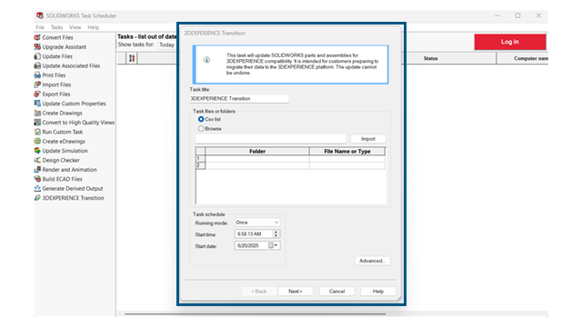 - Desde la tarea de transición de 3DEXPERIENCE, seleccione los archivos en los que desea ejecutar la macro.