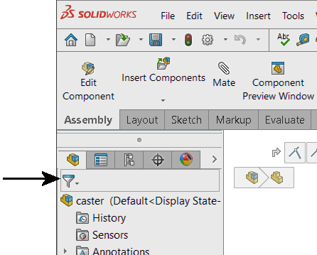 The FeatureManager design tree filter lets you search for specific features of parts and components of assemblies.
