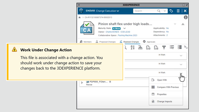 Cuando intenta guardar un archivo bloqueado en SOLIDWORKS, aparece una advertencia si el archivo se bloquea por una Change Action. La advertencia significa que no puede guardar el archivo en la plataforma hasta que se solucione la Change Action.