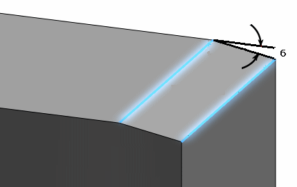 倒角 - 边线角度 倒角面到相邻面的角度太大或太小。 倒角边线角度是指倒角面与支撑面之间的角度。 (这是您在 SOLIDWORKS 中建模倒角时所指定的角度。) 当倒角边线角度太大或太小时,倒角面看起来就像是支撑面的一部分。 当该角度太平(小于 6°)或太陡(大于 89.999°)时,就会显示错误信息。 范例 最小边线角度: 范例 最大边线角度: 父主题倒角 倒角 - 宽度比率 倒角 - 宽度 倒角 - 支撑面角度 倒角 - 直倒角 倒角 - 多个 倒角 - 顶点 倒角 - 选择无效 倒角 - 一般错误