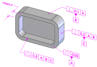 凹陷會以曲面輪廓公差來定位,包括沿凹陷壁套用的圓角及導角。會分別標註凹陷深度的尺寸。