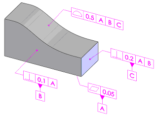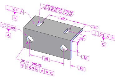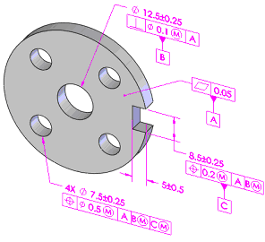 基準選擇被公差化以控制其相互關係。下列是前基準面 (A) 被選擇第一,中間鑽孔 (B) 為第二,及凹口 (C) 為第三來控制 4X 鑽孔複製排列的結果。