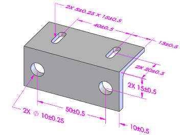 使用自動尺寸配置,您可以指定兩種公差類型之一,正與負或幾何。此選項影響用來控制填料、圓錐、鑽孔、凹口、溝槽、寬度、以及凹陷與輪廓特徵位置的公差類型。使用幾何公差,公差同時控制基準特徵之間的關係。