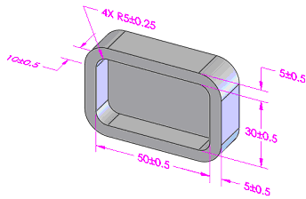 如果薄壁特徵是平行於參考特徵之一,則凹陷會以線性特徵來定位。圓角、導角、及凹陷的深度會根據大小來標註尺寸。