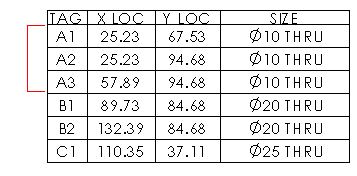 如果您在 PropertyManager 中產生的鑽孔表格標籤類型為手動,便可以編輯鑽孔表格標籤編號。