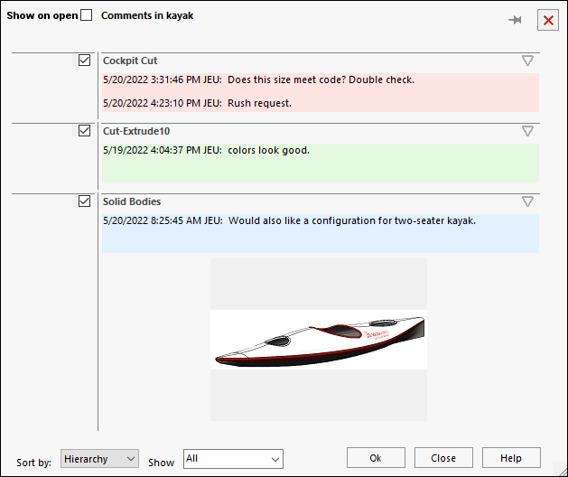 FeatureManager design tree. Comments display in tooltips, both in the Comments folder and for the item in the FeatureManager