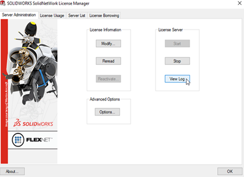 您可以通过查看许可证服务器上的日志来检查 FlexNet 版本。打开 SolidNetwork License Manager,然后单击服务器管理 > 查看日志。日志会将 FlexNet 许可版本列在开头的括号中。