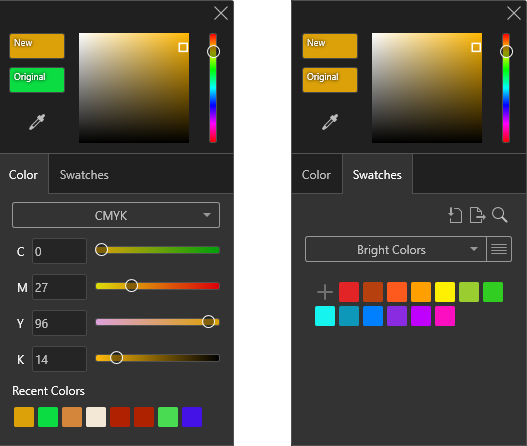 You can open the Color Picker dialog box from various Palette tabs and several dialog boxes.