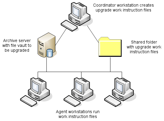 Для сокращения времени обновления можно одновременно выполнить обновление на нескольких рабочих станциях, на которых имеется инструмент обновления. Первая рабочая станция, на которой запускается инструмент обновления, выступает в качестве рабочей станции-координатора, создающей план обновления. План включает несколько файлов рабочих инструкций, по одному для каждой рабочей станции, участвующей в процессе обновления. Дополнительные сведения см. в разделе Создание и использование файлов рабочих инструкций.
