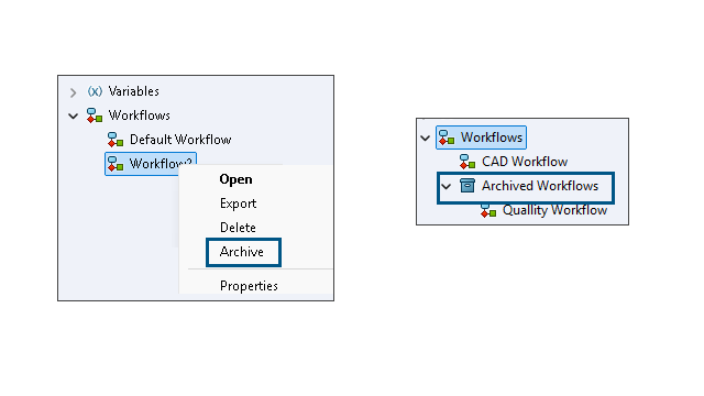 В инструменте администрирования SOLIDWORKS PDM можно архивировать рабочий процесс. Невозможно перевести или откатить файл в другое состояние в рамках архивированного рабочего процесса.